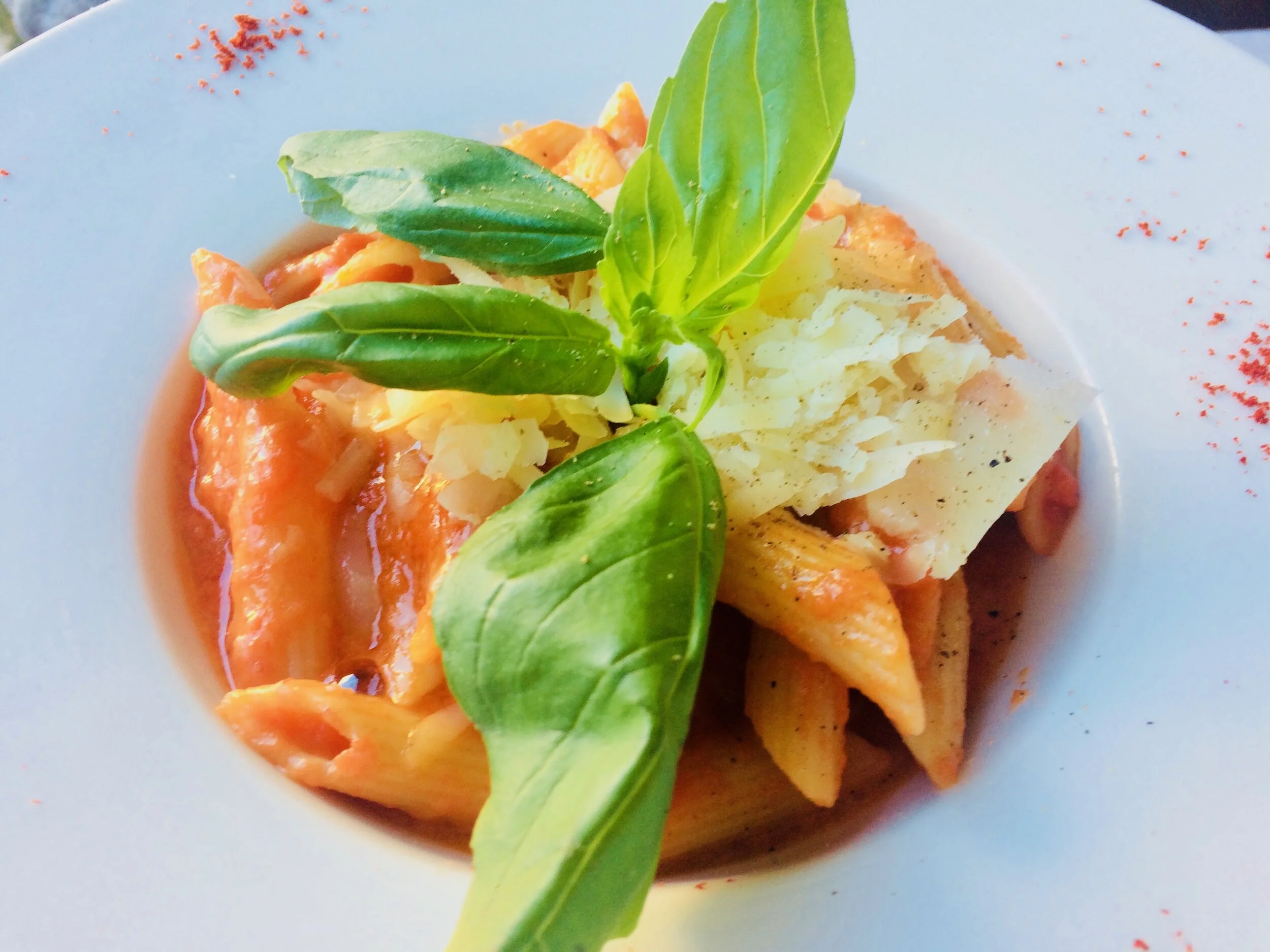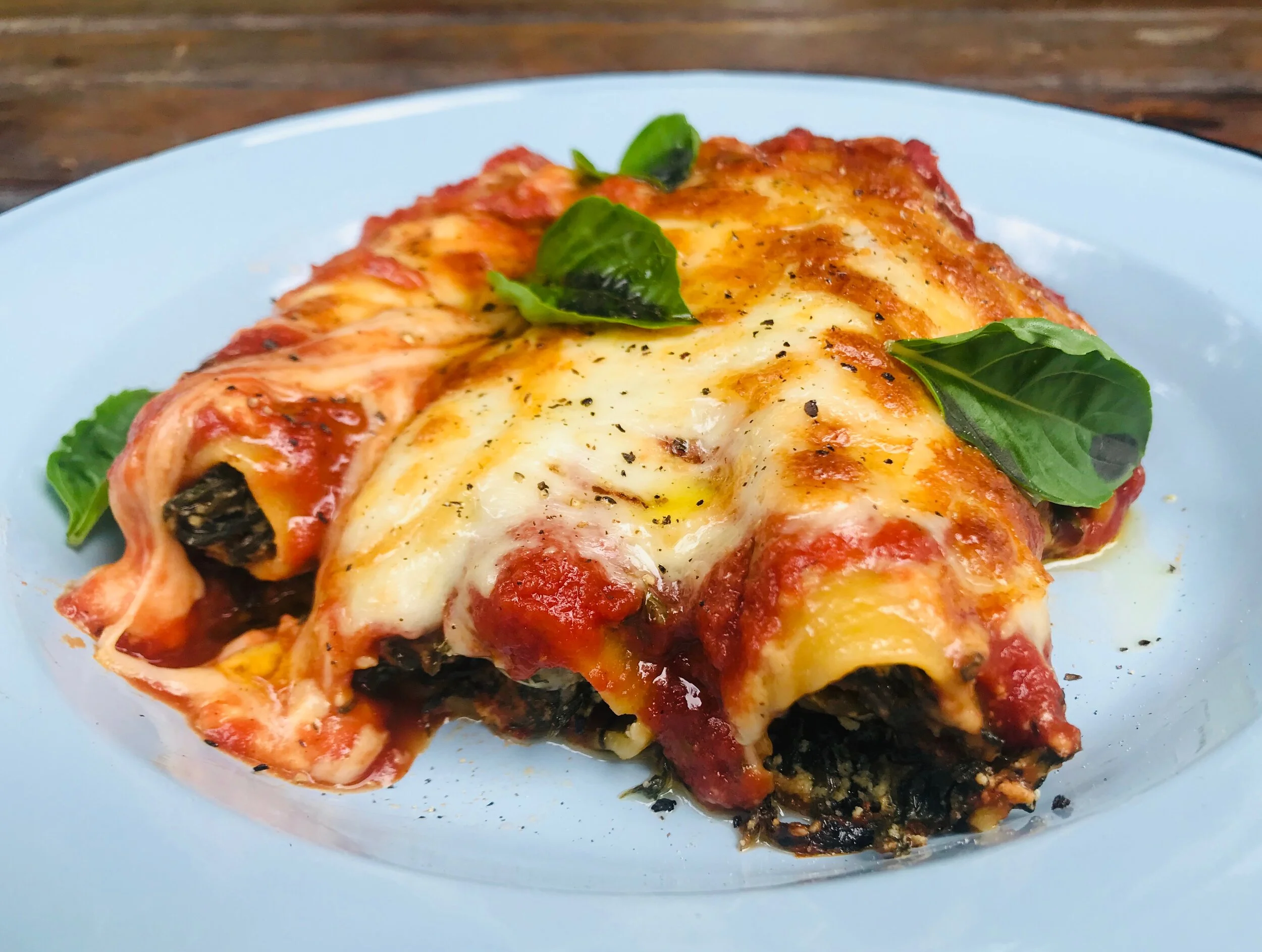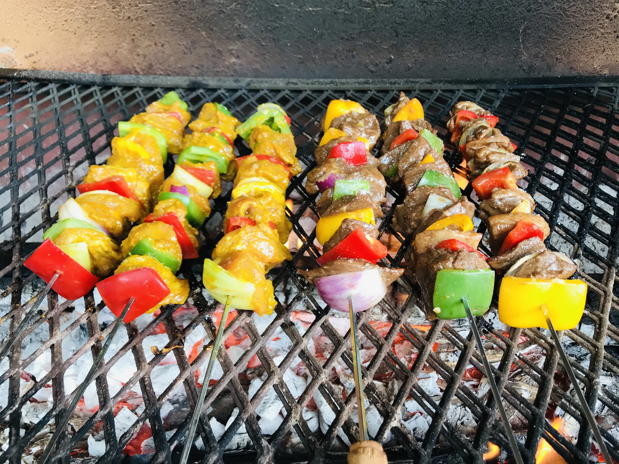 Grilled Venison Steaks topped with melted Camembert & caramelized red onion marmalade, with fire-baked potatoes, mixed griddled vegetables & a salad of baby spinach with dates & crunchy almonds