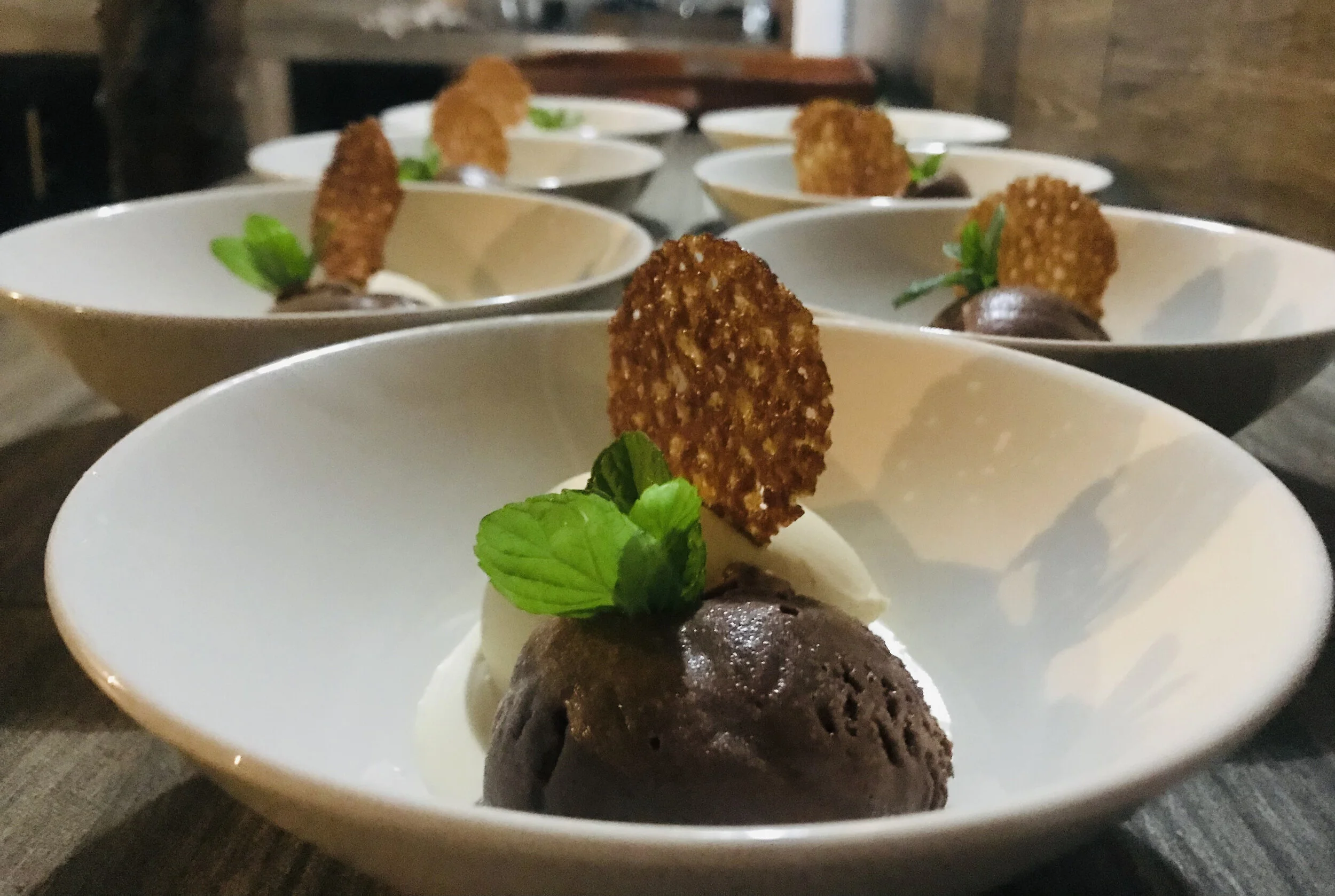 Trio of Chocolate Sorbets, Almond Tuile Basket, Chocolate Crumb & Strawberry Coulis