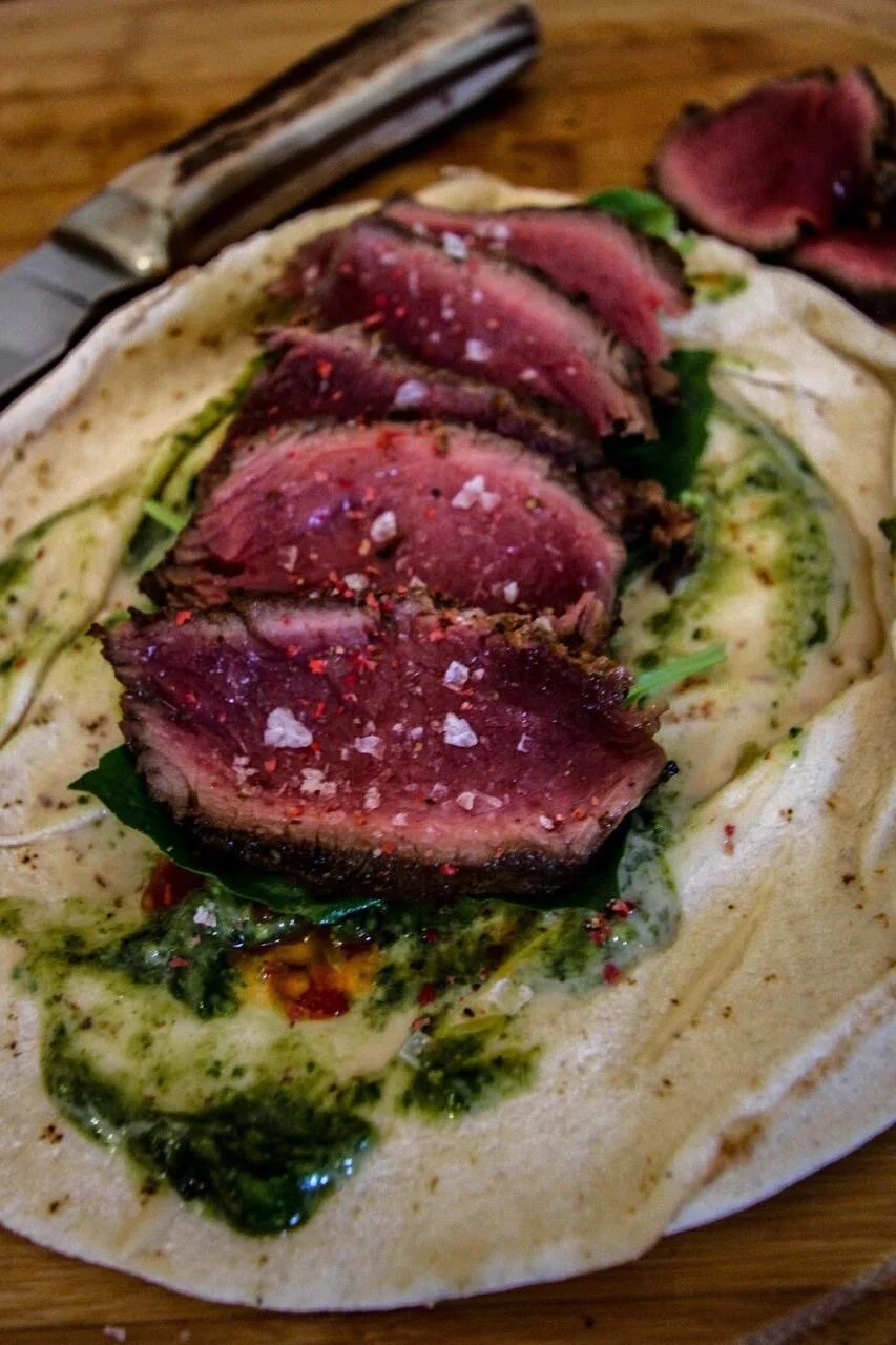 Griddled Pears wrapped in Prosciutto Ham / Sliced Venison Kidneys with Chimichurri Sauce